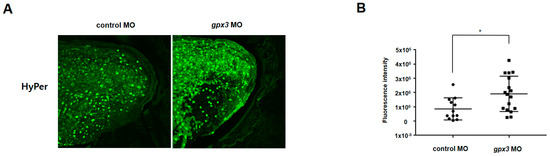 Perturbed gpx3 leads to increased reactive oxygen species (ROS) levels. Embryos were injected with 10 ng of HyPer mRNA at the 1-cell stage. MOs were injected into the ventral regions at the 4-cell stage. (A) gpx3 MO-injected embryos show increased HyPer fluorescent compared to the control. (B) HyPer fluorescence intensity quantification using ImageJ. * p < 0.05.