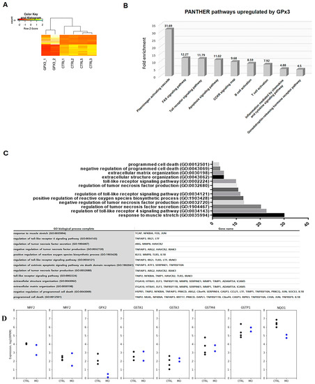 Effects of gpx3 knockdown on the Xenopus embryo transcriptome. (A) Heat map showing significant differences between control and gpx3 MO-injected embryos. (B) Transcriptome enrichment analysis using PANTHER indicated that cell death processes are significantly upregulated in gpx3-depleted embryos. (C) Gene ontology (GO-terms) and genes also indicated that genes associated with apoptosis and cell-death-related pathways were significantly affected by gpx3 depletion. (D) The expression of Nrf2 and its putative targets were not affected by gpx3 knockdown.