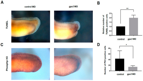 gpx3 suppression activates apoptosis and inhibits cell proliferation in gpx3 morphants. (A) The expression and number of terminal deoxynucleotidyl transferase dUTP nick end labeling (TUNEL)-positive cells were higher in gpx3 knockdown embryos compared to control embryos. (B) Relative TUNEL expression, indicating a significant increase in apoptotic cells in gpx3 morphants. ** p < 0.001. (C) gpx3 loss resulted in reduced phospho-histone 3 (PH3)-positive cells in the tail region of gpx3 knockdown embryos. PH3-positive cells are indicated by the color purple, whereas β-gal staining is indicated by the color blue. (D) The relative PH3 expression showed cell proliferation was significantly reduced by gpx3 knockdown. * p < 0.05.