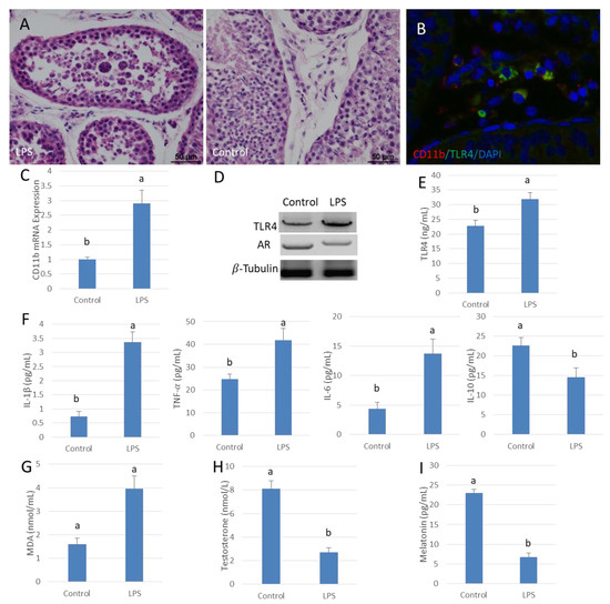 Lipopolysaccharide (LPS) reduces testosterone content in sheep testis. (A) Testis HE stains. Testes injected with saline were used as the control. Spermatogenesis was disturbed in the LPS injection group (left). (B) Testicular tissue immunofluorescence, CD11b (Red), TLR4 (Green) and DAPI (Blue). (C) CD11b gene mRNA expression in the LPS injection group. (D) Western blot analysis of TLR4 and AR in testis. (E,F) ELISA testing of TLR4, IL-1β, TNF-α, IL-6 and IL-10 protein expression. (G) MDA content in the LPS infected testis group. (H,I) ELISA detection of testosterone and melatonin concentrations. Data are shown as mean ± SEM. Different superscript letters (a, b) in each column represent statistically significant differences (p < 0.05).