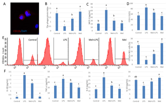Melatonin improves phagocytosis in LPS-treated testicular macrophages. (A) Immunofluorescence stain in cultured testicular macrophages, CD11b (Red) and DAPI (Blue). (B) Phagocytosis. (C,D) ELISA was used to detect the expressions of MCP-1 and COX-2. (E) Expression of CD163 was analyzed by flow cytometry. (F) ELISA detection IL-1β, TNF-α, IL-6 and IL-10 protein expression. Experiments were divided into the control group, the LPS infection group, and the Mel+LPS and Mel group. Data are shown as mean ± SEM. Different superscript letters (a–c) in each column representative statistically significant differences (p < 0.05).