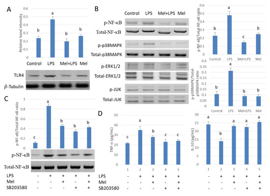 Melatonin regulates NF-𝜅B expression through the p38/MAPK signaling pathway in TM. Western blotting detection (A) expression of TLR4 and (B) p-p38MAPK/p38MAPK, p-JUN/JUN, p-ERK1/2/ERK1/2 and p-NF-кB/NF-кB. Four groups were used in this study: the control, LPS infection, Mel+LPS and Mel. (C) p-NF-𝜅B/NF-𝜅B expression Western Blotting detects. (D) TNF-𝛼 and IL-10 protein expressions detected by ELISA. TM treated with LPS, Mel, and/or SB203580. Data are shown as mean ± SEM. Different superscript letters (a–c) in each column representative statistically significant differences (p < 0.05).