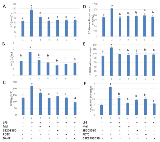 Melatonin reduces GCH1 activity and Nox2 mRNA expression in LPS-stimulated testicular macrophages. (A) NO content. (B) iNOS activation. (C) ELISA detection of GCH1 protein expression. TM treated with LPS, Mel, PDTC, DAHP and/or SB203580. (D) Flow cytometry analysis of ROS content. (E) NADPH oxidase activation. (F) mRNA expression of Nox2. TM treated with LPS, Mel, PDTC, GSK2795039 and/or SB203580. Data are shown as mean ± SEM. Different superscript letters (a–d) in each column representative statistically significant differences (p < 0.05).