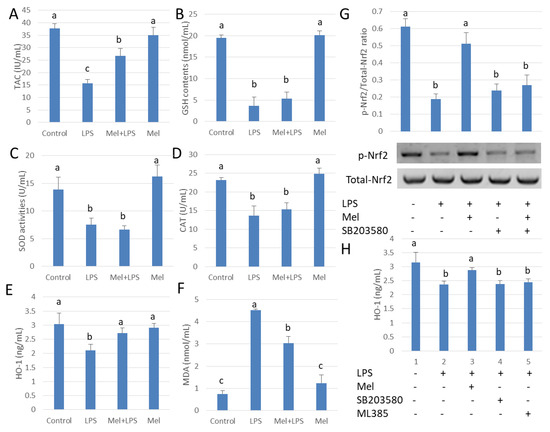 Melatonin up-regulated HO-1 expression attenuates LPS-induced oxidative damage in testicular macrophages. (A) TAC activation. (B) GSH activation. (C) SOD activation. (D) CAT activation. (E) ELISA detection for HO-1 protein expression. (F) MDA content. Experiments were carried out into control group, LPS infection group, Mel+LPS group and Mel group. (G) Western blotting using to detect p-Nrf2/Nrf2 expression. TM treated with LPS, Mel and/or SB203580. (H) ELISA used to detect HO-1 protein expression. TM treated with LPS, Mel, ML385 and/or SB203580. Data are shown as mean ± SEM. Different superscript letters (a–c) in each column representative statistically significant differences (p < 0.05).