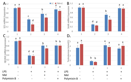 Melatonin increases testosterone content in an LPS-induced Leydig cell co-cultured system with testicular macrophages. qRT-PCR detection (A) SF1, (B) StAR, (C) mRNA expression and (D) testosterone levels in Leydig cell (LC) and in co-cultures with testicular macrophages (TM) detected by ELISA. Cell treated with LPS, Mel and/or polymixin B. Data are shown as mean ± SEM. Different superscript letters (a–d) in each column representative statistically significant differences (p < 0.05).