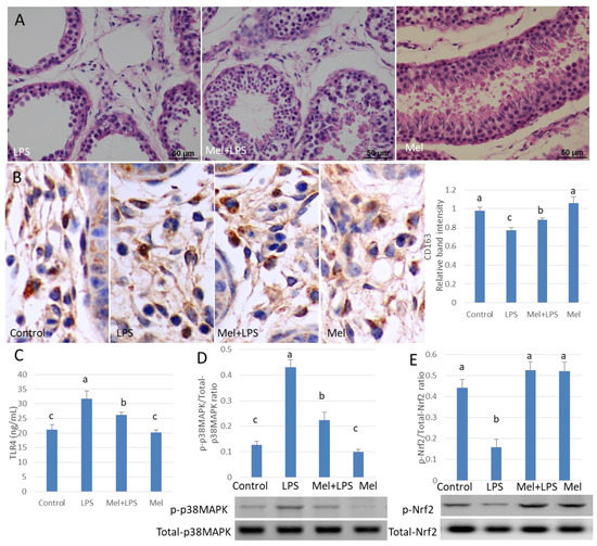 Melatonin alleviates LPS-induced sheep orchitis. (A) Testis histopathological HE stains. (B) Expression of immunohistochemical CD163 in testicular tissue. (C) ELISA detects TLR4 protein expression. Protein expression of (D) p-p38MAPK/p38MAPK and (E) p-Nrf2/Nrf2 was detected by Western blotting. All the above experiments were divided into a control group (testicular local injection of saline), LPS injection group, LPS + Mel injection testis group and Mel injection testis group. Data are shown as mean ± SEM. Different superscript letters (a–c) in each column representative statistically significant differences (p < 0.05).