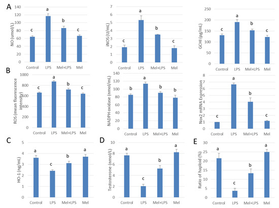 2.5. Effects of Regionally Injecting LPS with or without Melatonin into Testes