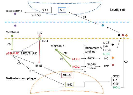 During inflammation, chemical agents and free radicals secreted by testicular macrophages inhibit the expression of steroid synthesis related proteins and genes in Leydig cells; this is associated with down-regulation of testosterone synthesis [51]. Most often the primary cause of infertility in human males is inflammation or autoimmunity. Testicular inflammation resulting from bacterial infections of the genitourinary system, sexually transmitted diseases, and non-reproductive system infections (e.g., mumps, SARS, and tuberculosis) often leads to temporary or permanent male infertility. Our results show that by activating TLR4 signaling pathways, melatonin inhibited transcription of regulatory factor NF-кB through p38MAPK pathways in testicular macrophages. As a result, IL-10 levels were elevated to resist the inflammatory response. Also, the synthesis of testosterone in testicular Leydig cells was promoted. Melatonin decreased expression of GCH1 and Nox2 in testicular macrophages via the TLR4 pathway. These changes then reduced iNOS and NADPH oxidase activity, removed the excessive free radical-mediated oxidative damage and restored testosterone synthesis in Leydig cells. Due to the participation of the Nrf2 pathway, melatonin upregulates HO-1 antioxidant protein expression to ease the level of oxidative stress in orchitis (Figure 9). This study provides a reference for melatonin treatment of orchitis caused by Gram-negative bacteria, and also suggests the use of methoxyindole as a treatment of orchitis caused by RNA virus infection.