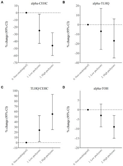 The association between smoking and vitamin E serum and urinary metabolites is displayed in Table 2 and Table S4. After adjusting for age, sex and potential confounding factors such as BMI and alcohol consumption, there was no evidence for a difference in mean α-TOH (−3% Beta (95% CI: −8, 2)) level between current smokers and never-smokers. For the urinary α-TOH metabolites, current smoking was associated with a 32% lower α-CEHC (−32% Beta (95% CI: −44, −18)) and a 32% higher TLHQ relative to CEHC ratio (32% Beta (95% CI: 14, 53)), after adjustments for possible confounding. In addition, we observed no difference in mean levels of α-TOH or its metabolite levels between never smokers and past smokers. An increased smoking intensity (measured in pack years, and restricted to never and current smokers) was associated with lower α-TOH levels, with current smokers grouped in the high pack years group having a 10% (95% CI: −16, −3)) lower α-TOH level than never smokers (Figure 1D). For urinary vitamin E metabolites, both low and high pack years were associated with reduced α-CEHC (Figure 1A) and an increased TLHQ relative to CEHC ratio (Figure 1C, Table S4), in a clear dose–response relationship. Notably, α-CEHC was 25% (95% CI: −43, −2) lower in current smokers with low pack years and 46% (95% CI: −59, −28) lower in current smokers with high pack years, than in never smokers. The TLHQ relative to CEHC ratio was 24% (95% CI: 2, 52) higher in current smokers with low pack years and 55% (95% CI: 25, 93) higher in current smokers with high pack years, than in never smokers.