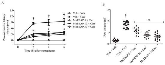 (A) Intraplantar injection of carrageenan caused thermal hyperalgesia. This response was blocked by Mn (III) tetrakis (4-benzoic acid) porphyrin (MnTBAP) (5–30 mg/kg). Drugs were given intraperitoneally (i.p.) 15 min before the intraplantar injection of carrageenan. (B) The development of thermal hyperalgesia coincided with oedema formation. Injection of different doses of MnTBAP (5–30 mg/kg) was able to reduce oedema. The paw volume (mL) obtained at 6 h after the intraplantar injection of carrageenan. Results are expressed as mean ± SEM for 12 rats. Results are expressed as mean ± SEM for 12 rats. † p < 0.05 compared to Veh + Veh; * p < 0.05 compared to Veh + Carr.