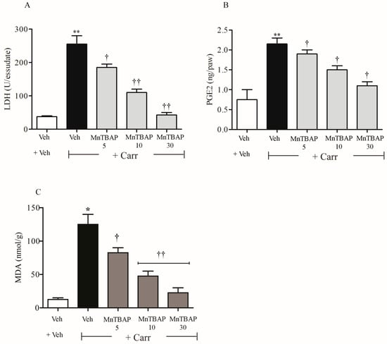 Intraperitoneal injection of MnTBAP in different doses (5–30 mg/kg) led to an improvement in lactate dehydrogenase (LDH) (A), prostaglandin E2 (PGE2) (B), and malondialdehyde (MDA) (C) levels in paw exudates, observed following the intraplantar injection of carrageenan. Results are expressed as mean ± SEM for six rats. * p < 0.01, ** p < 0.001 compared with Veh + Veh; † p < 0.01, †† p < 0.001 compared with Veh + Carr.