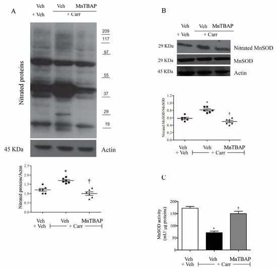 (A,B) When compared with the vehicle (Veh) group, animals with carrageenan showed nitration of total proteins, including manganese superoxide dismutase (MnSOD). (C) Nitration of MnSOD was linked to the deactivation of MnSOD’s enzymatic function. Compared with the vehicle group, animals that received a carrageenan injection showed lower levels of MnSOD activity in the paws. (A–C) Pretreatment with MnTBAP (10 mg/kg) restored the total proteins and MnSOD nitration and its activity in carrageenan-inflamed rats. No difference in MnSOD or β-actin expression was detected among the lanes in these conditions. The gels are representative of results from six animals, and the histogram represents densitometric analyses of all animals per group. Results are expressed as mean ± SEM for six rats. * p < 0.001 compared to Veh + Veh; † p < 0.001 compared to Veh + Carr.