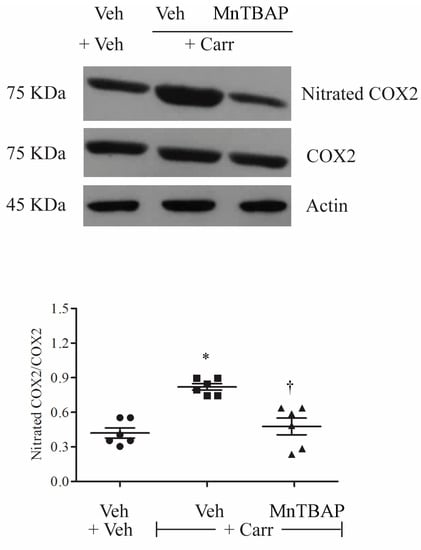 Compared with the vehicle group, animals that received a carrageenan injection showed significant nitration of cyclooxygenase 2 (COX-2). Administration of MnTBAP (10 mg/kg) 15 min before carrageenan partially attenuated COX-2 nitration. No difference for COX-2 or β-actin expression was detected among the lanes in these conditions. Gels are representative of results from six animals, and the histogram represents densitometric analyses of all animals per groups. Results are expressed as mean ± SEM for six rats. * p < 0.001 compared to Veh + Veh; † p < 0.001 compared to Veh + Carr.