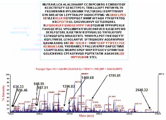 Proteins of paw soft tissue, obtained as previously described through cytosolic extraction, were solubilized in NuPage LDS Sample Buffer (invitrogene), heated at 70 °C for 10 min, separated on precast 4–20% Bis-Tris gels (Invitrogen), and stained with colloidal Coomassie Blue. After visualization, each protein spot was cut and each gel slice was de-stained in 50 mM ammonium hydrogen carbonate/acetonitrile 1:1, and covered with acetonitrile for the reduction of gel pieces. Under a vacuum, centrifugation was performed to remove acetonitrile and to try gel particles. Proteins were suspended in 10 mM dithiothreitol (DTT) and 25 mM (NH4)2CO3 at 56 °C for 30 min, and then cooled and alkylated in 55 mM Iodoacetamide (IAA) and 25 mM (NH4)2CO3 for 30 min in the dark at room temperature. Gel pieces were washed in 50 mM (NH4)HCO3/CH3CN 1:1 for 15 min and covered by acetonitrile until gel pieces shrunk. Under the vacuum, centrifugation allowed acetonitrile removal and gel particles drying. In-gel digestion was performed overnight at 37 °C under stirring, by adding 12.5 ng/μL of trypsin in 25 mM (NH4)2CO3. MALDI mass spectra were recorded directly from the overlay.