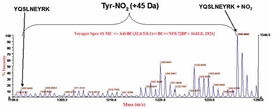 Samples (1 μL) were applied to the target and air-dried. Subsequently, 1 μL of α-cyano-4- hydroxycinnamic acid (10 mg/mL) in 50 % acetonitrile and 0.1 % Trifluoroacetic acid (TFA) (v/v) was applied to the sample and dried again. MALDI mass spectra were recorded using a Voyager-DE STR Applied Biosystems, (United States), a MALDI time-of-flight (MALDI-ToF) mass spectrometer, using the reflectron mode of operation. Ionization was performed with a 337 nm pulsed nitrogen laser. Mass calibration was internally performed using the molecular ions from the trypsin autodigestion. Raw data were analysed using Data Explorer software provided by the manufacturer, and reported as monoisotopic masses. MALDI mass spectra were compared to identify signals with a mass difference of 45 kDa (aminoacidic nitration).