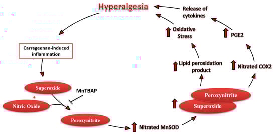 In particular, peroxynitrite, a pro-inflammatory and cytotoxic agent, is responsible for protein nitration, including MnSOD, a mitochondrial enzyme able to desmute and remove high levels of superoxide (Figure 7). In the last decade, it has been observed that post-translational modifications of MnSOD are crucial for the continuous formation of free radicals. In fact, when nitrated MnSOD is inactive, it leads to a vicious cycle of free radical formation. This event leads, in turn, to a nitrosative condition, with the nitration of several crucial enzymes involved in the development and maintenance of hyperalgesia and central sensitization, which maintains nociceptive signaling, in pain of different etiologies [21,54,56,57]. In particular, in the present set of experiments, we observed that COX-2 nitration and activation occur in concomitance of MnSOD nitration and deactivation, in the presence of paw oedema and hyperalgesia. Moreover, with the administration of MnTBAP, a peroxynitrite decomposition catalyst, we observed a reduction of these proteins’ nitration and hyperalgesia, most probably due to the peroxynitrite removal.