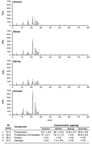 We qualitatively and quantitatively analyzed the polyphenolic profile of CP through the seasonal samples collected over a 1-year period. According to the designed HPLC–UV–DAD method, CP showed a similar qualitative constitution among the seasonal samples, mainly composed by phenolic acids and flavonoids (Figure 1). By using the previously identified poplar-type markers in CP (pinocembrin, chrysin, galangin and pinobanksin-3-O-acetate) [36], we observed quantitative and significant differences in those compounds among CP seasonal samples. Pinocembrin, together with pinobanksin-3-O-acetate, were the poplar markers that showed the most evident seasonal effects in CP (Figure 1). Pinocembrin, as well as pinobanksin-3-O-acetate, presented their highest concentration in summer samples (45.8 ± 3.8 and 24.9 ± 0.5 µg/mg, respectively), followed by winter (30.1 ± 0.2 and 13.7 ± 1.5 µg/mg, respectively); meanwhile, their presence was significantly lower in autumn (19.1 ± 3.0 and 9.1 ± 0.1 µg/mg, respectively), and even lower in the spring seasonal samples (12.8 ± 2.3 and < 5.0 µg/mg, respectively). These results indicated that the concentration of poplar-type flavonoids is quantitatively affected in CP by seasonal shifts, even though there is a qualitative resemblance found in the chemical profile of CP among seasonal samples (Figure 1).