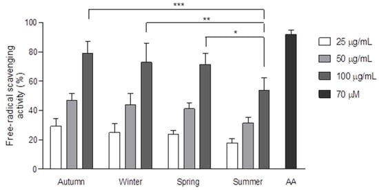 The influence of seasonal effects on free radical scavenging capacity was assessed by DPPH assay (Figure 2). CP collected in autumn, winter and spring presented similar antioxidant potentials (IC50: 58.8 ± 6.7, 65.7 ± 12.2 and 67.0 ± 7.5 µg/mL, respectively). CP collected in summer showed a lesser antioxidant capacity among the seasonal samples (IC50: 98.7 ± 2.5 µg/mL). Statistical differences were found among the antioxidant activity of CP seasonal samples at 100 µg/mL; CP from autumn, winter and spring were able to reduce DPPH radical up to 80% at 100 µg/mL, while CP from summer reduced 54% of the DPPH radical at the same concentration (p < 0.05). Ascorbic acid (AA) was used as antioxidant control (91.6% at 70 µM, Figure 2) in the DPPH assay according to previous studies [20,39]. At 100 µg/mL, no significant differences were found in the antioxidant capacity between CP from autumn, winter and spring and ascorbic acid (70 µM), indicating a high free radical scavenging capacity in those seasonal samples of CP.