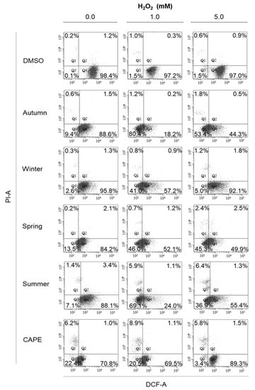 In order to evaluate the antioxidant potential of seasonal samples of CP against biological ROS in the cellular environment, a cellular antioxidant activity (CAA) assay was performed in M12.C3.F6 cells under different oxidative stress conditions (0, 1 and 5 mM H2O2). Given the methodological characteristics of the assay, we analyzed only the metabolically active cell population with membrane integrity. By considering DCF and PI fluorescence, none of the CP seasonal treatments, together with H2O2 treatment conditions, significantly affected cell viability or membrane integrity during the 1 h period (Figure 3, Q1 and Q2). Dot plots depicted in Figure 3 illustrate the DFC and PI fluorescence distribution among M12.C3.F6 cells treated with CP and H2O2 (0, 1 and 5 mM), wherein lower quadrants (Q3 and Q4) comprise viable cells (negative to PI). At least 90 to 95% of M12.C3.F6 cells (Q3 and Q4) were viable and morphologically similar to those cells pretreated with dissolvent control (DMSO). Cellular morphology distribution of treated M12.C3.F6 cells with CP seasonal samples and H2O2 (1 and 5 mM) did not appear to be affected, in comparison to the forward scatter (FSC) and side scatter (SSC) parameters of cells treated with DMSO and H2O2 (data not shown). CAPE was included as a CAA control based on previous studies [35]. Interestingly, a more homogeneous distribution of the cell population was observed in M12.C3.F6 cells treated with seasonal samples of CP and H2O2, similar to CAPE, showing a remarkable fluorescence displacement from Q4 to Q3 (Figure 3) in comparison to the dissolvent control (DMSO) and H2O2. These results suggest that CP not only induced CAA on M12.C3.F6 cells by reducing the MFI values (DCF) of intracellular ROS after H2O2-stress induction, but also morphological protection against oxidative stress.
