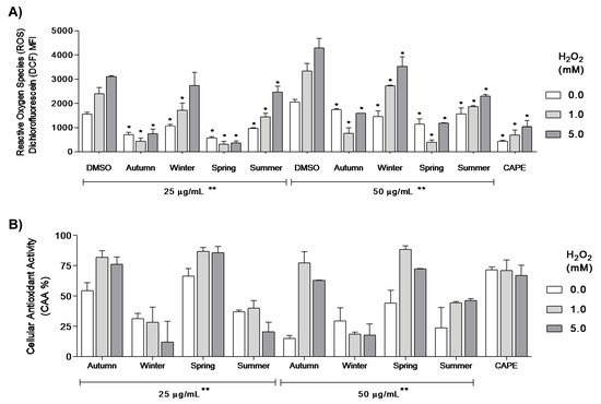 Cellular antioxidant activity (CAA) of seasonal samples of CP (25 and 50 µg/mL) in M12.C3.F6. Oxidative stress was induced with H2O2 (1 and 5 mM). M12.C3.F6 cells were treated for 1 h with seasonal samples of CP, then harvested, washed and incubated with DCFH-DA (1 µM), then with H2O2 (1 and 5 mM), and stained with PI (1 µg/mL). (A) The effect of seasonal samples of CP (25 and 50 µg/mL) on reactive oxygen species (ROS) production in M12.C3.F6 cells treated with 0, 1 and 5 mM H2O2, according to Dichlorofluorescein (DCF) mean fluorescence intensity (MFI) in fluorescence intensity arbitrary units (FIAU). (B) CAA of seasonal samples of CP in M12.C3.F6 cells is expressed in percentage, as obtained by comparison to ROS production (DCF MFI) in M12.C3.F6 treated with dimethyl sulfoxide (DMSO) dissolvent control under oxidative stress with 1 and 5 mM H2O2. The displayed results are the mean of at least two independent experiments ± standard deviation. CAPE (5 µM) was included as positive control for CAA assays. Data were analyzed by a Mann–Whitney U non-parametric test to compare each CP treatment condition or CAPE group to DMSO control (25 or 50 µg/mL). Significant differences between CAA of the seasonal samples to DMSO control are indicated * (p < 0.05). A Kruskal–Wallis test was used to compare differences in population distribution amongst all treatments on each tested concentration (25 and 50 µg/mL), significant differences (p < 0.05) were found in CAA amongst groups (25 and 50 µg/mL) and are marked as **.