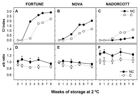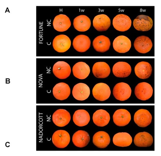 3.1. Incidence of Chilling Injury and Changes in Peel Pigmentation of Fortune, Nova and Nadorcott Mandarins during Cold Storage