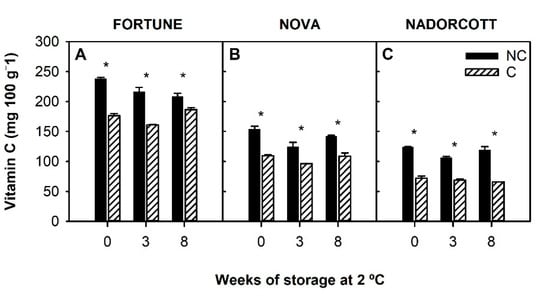 3.2. Changes in Carotenoids and Vitamin C in the Peel of Fortune, Nova, and Nadorcott Mandarins during Cold Storage