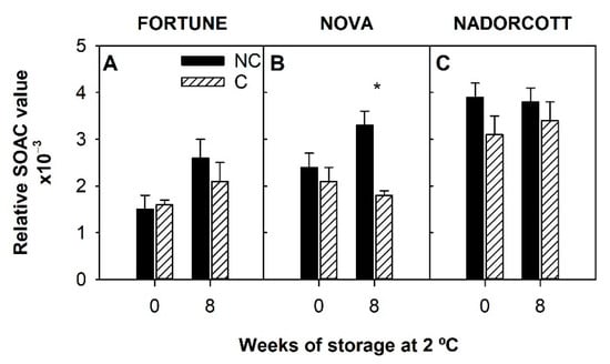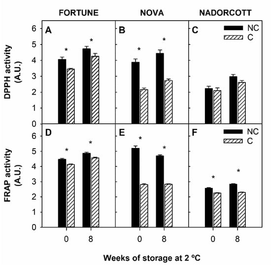 3.3. Antioxidant Activity and Singlet Oxygen Absorption Capacity in the Peel of Fortune, Nova, and Nadorcott Mandarins during Cold Storage