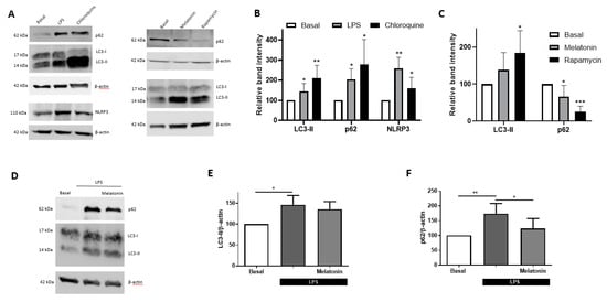 Autophagy and NLRP3 measurements in BV2 cultures. (A) Representative immunoblots of p62, LC3 and NLRP3 expression. (B) Analysis of p62, LC3-II and NLRP3 in BV2 cells treated with lipopolysaccharide (LPS) (1 µg/mL) or chloroquine (50 nM) for 4 h (n = 5). * p < 0.05, ** p < 0.01 vs. Basal cells. Unpaired t test. (C) Analysis of p62 and LC3-II, in cells incubated with melatonin (10 nM) or rapamycin (27 nM) for 24 h. * p < 0.05, *** p < 0.001 vs. Basal cells. Unpaired t-test. (D) Representative immunoblot of p62 and LC3 expression in BV2 cells. Analysis of (E) LC3-II and (F) p62 in 24 h pretreated cells with or without melatonin (10 nM) followed by incubation with LPS (1 µg/mL) during 4 h. * p < 0.05 and ** p < 0.01 vs. LPS-treated cells. One-way ANOVA test with Tukey’s multiple comparisons test. Data of all experiments are represented as mean ± SD.