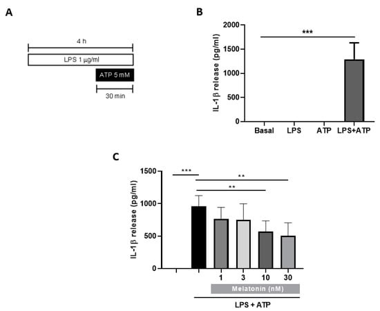 IL-1β release and cell death in glial cultures stimulated with LPS and extracellular adenosine triphosphate (ATP). (A) Protocol used to induce IL-1β release. Mixed glial cultures were treated with LPS (1 µg/mL) for 4 h and ATP (5 mM) during the last 30 min. (B) IL-1β release (measured by ELISA) of cell cultures treated with LPS for 4 h, ATP for 30 min, or a combination of both stimuli (n = 4). (C) IL-1 β measurement in cell cultures pretreated with melatonin (1, 3, 10, 30 nM) prior to LPS (1 µg/mL) plus ATP (5 mM) stimulation (n = 5). *** p < 0.001 and ** p < 0.01 vs. LPS+ATP. One-way ANOVA with Tukey’s multiple comparisons test. Data of all experiments are represented as mean ± SD.