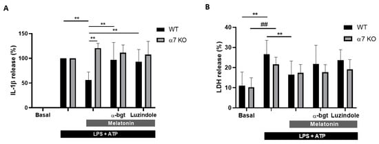 IL-1β release and cell death analyses in mixed glial cultures obtained from WT and α7 nAChRs knock-out (KO) mice stimulated with LPS and ATP (see protocol in Figure 2A). Melatonin (10 nM), α-bungarotoxin (α-bgt, 100 nM) and luzindole (1 μM) were added to the medium 24 h before stimulation with LPS (1 µg/mL). (A) IL-1β release of treated glial cultures from wild-type (WT) (n = 7) and α7 nAChRs KO (n = 5) mice. LPS+ATP values were considered the maximum release (100%). ** p < 0.01 vs. Melatonin WT. (B) Cell death analysis of treated glial cultures from WT (n = 7) and α7 nAChRs KO (n = 7) mice. ** p < 0.01 vs. LPS+ATP WT, ## p < 0.01 vs. LPS+ATP α7 KO. Two-way ANOVA with Tukey’s multiple comparisons test. Data of all experiments are represented as mean ± SD.