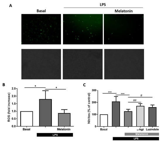 Notwithstanding the above, melatonin presents several antioxidant effects that afford protection against cellular stress []. In this research, we hypothesized that melatonin could reduce oxidative stress in microglia. For the achievement of the purposes, we used BV2 microglial cells which were stimulated during 4 h with LPS (1 µg/mL), and intracellular ROS production was measured by the fluorescent probe H2DCFDA. Previously, cultures were pre-treated with melatonin (10 nM) for 24 h. After the specified time, we took representative fluorescent images of every culture that were analyzed to determine the intensity of fluorescence and, consequently, the burden of intracellular ROS. LPS treatment increased the production of ROS in BV2 cell cultures by 1.8-fold, whereas melatonin totally abolished LPS-induced ROS generation (Figure 4A,B). Moreover, to evaluate another parameter related to oxidative stress and cellular damage, we tested the release of nitrites by Griess reaction. Stimulation of microglial cultures with LPS (1 µg/mL) during 24 h produced the release of nitrites in the culture medium (107% of increase compared to non-treated cells), while melatonin (10 nM) lowered the levels of nitrites release (126%) compared to control levels. The antioxidant effect was lost when we administered α-bgt (100 nM) and luzindole (1 μM) to the cultures, rising nitrites levels by 170% (Figure 4C). Considering these results, we have observed a relationship between the reduction of IL-1β and oxidative stress levels after 4 h of the inflammatory stimulus; additionally, melatonin was not able to reduce neither IL-1β release nor nitrites production when α7 nAChRs were blocked.