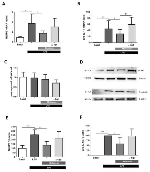 Once we demonstrated that melatonin modifies IL-1β release and may be related to the decrease of ROS levels, we decided to explore the genetic expression and protein levels of NLRP3 inflammasome components. We analyzed the changes in NLRP3, pro-IL-1β and pro-caspase-1 gene expression after the treatment of BV2 cells with LPS (1 µg/mL) during 4 h. Previously, cells were incubated for 24 h with melatonin (10 nM) in the presence or absence of α-bgt (100 nM). qRT-PCR analysis revealed that LPS increased by 3.7- and 4.5-fold NLRP3 and pro-IL-1β gene expression, respectively. In both cases, melatonin significantly reduced NLRP3 and pro-IL-1β gene expression, whereas α-bgt partially reverted the melatonin effect (Figure 5A,B). Regarding pro-caspase-1, we did not detect any change in gene expression (Figure 5C). We also analyzed by Western blot the inflammasome protein levels in BV2 microglia cells. NLRP3 protein levels increased above 150% compared to basal conditions (Figure 5D,E). BV2 cultures did not express pro-IL-1β in non-stimulated conditions, whereas it was strongly induced in LPS-treated cultures (Figure 5D,F). In both cases, pretreatment with melatonin (10 nM) significantly reduced the increase produced by LPS; in contrast, α-bgt (100 nM) abolished the effect induced by melatonin (Figure 5D–F). Thus, melatonin is able to decrease the expression of inflammasome proteins through α7 nAChRs in microglial cells.
