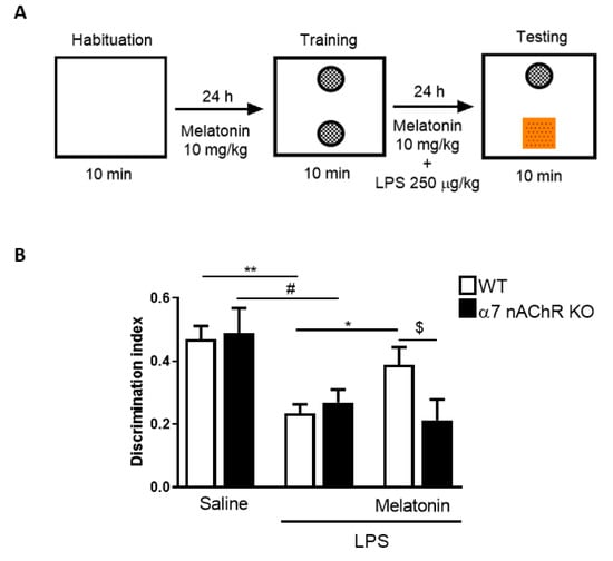 Melatonin effects on novel object recognition (NOR) test in WT and α7 nAChR KO mice. (A) Illustration of the protocol used to evaluate NOR test. WT and α7 nAChR KO mice were treated with melatonin (10 mg/kg, i.p.), and after 24 h were injected with LPS (250 μg/kg, i.p.). Next day mice were subjected to the test. (B) Discrimination index in WT and α7 nAChR KO mice in saline-treated, LPS-treated and melatonin-treated groups (n = 7–8 per group). * p < 0.05 and ** p < 0.01 vs. LPS WT; # p < 0.05 vs. LPS α7 nAChR KO; $ p < 0.05 vs. LPS + Melatonin WT. Two-way ANOVA with Tukey’s multiple comparisons test. Data of all experiments are represented as mean ± SD.