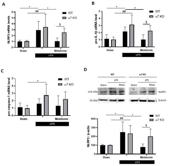 Mice subjected to NOR were euthanized immediately after the test, the brains were gently removed and the hippocampi were dissected. The hippocampi were used to analyze inflammasome genes and protein expression by qRT-PCR and Western blot, respectively. In WT mice, we found that LPS (250 µg/kg, i.p.) produced a significant increase in NLRP3 and pro-IL-1β gene expression (between 2- and 3-fold). In both cases, melatonin treatment (10 mg/kg, i.p.) reduced their expression (Figure 7A,B). As occurred in the BV2 culture model, neither LPS nor melatonin modified pro-caspase-1 gene expression (Figure 7C). In α7 nAChRs KO mice, we observed that LPS produced a similar increase in NRLP3 and pro-IL-1β gene expression, whereas melatonin did not reduce the expression of any of these genes (Figure 7A,B). Furthermore, we found significantly higher gene expression levels in α7 nAChRs KO melatonin-treated mice compared to melatonin-treated WT mice. Regarding protein expression, Western blot revealed that NLRP3 is increased by 150% in both LPS-treated groups compared to the sham. Melatonin lowered NLRP3 protein to sham levels in WT mice, while in α7 nAChRs KO melatonin-treated animals had significantly elevated NLRP3 expression compared to melatonin-treated WT group (Figure 7D).