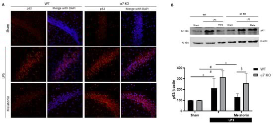 Autophagic marker p62 in the hippocampus of WT and α7 nAChR KO mice after LPS and melatonin treatments as described in Figure 6A. (A) p62 immunostaining of CA1 region of the hippocampus of mice injected with melatonin (10 mg/kg) followed or not by LPS (250 µg/kg) after 24h. Original magnifications for all images, 40×. (B) Representative immunoblot and quantification of p62 protein expression analyzed by Western Blot in the hippocampus of WT and α7 nAChR KO mice. * p < 0.05 vs. LPS WT; # p < 0.05 vs. LPS α7 nAChR KO; $ p < 0.05 vs. LPS + Melatonin WT. Two-way ANOVA test with Tukey’s multiple comparisons test. Data of all experiments are represented as mean ± SD.