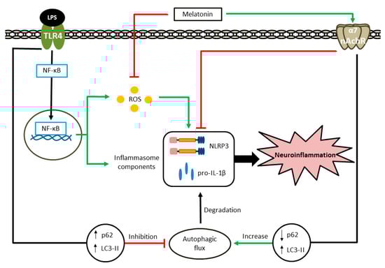 Illustration showing melatonin actions that reduce NLRP3 inflammasome expression. LPS activates TLR4 receptor that leads to an increase of ROS production and NLRP3 inflammasome components expression. Moreover, p62 and LC3-II proteins are raised, which means that autophagic flux is inhibited. As a result, NLRP3 and pro-IL-1β accumulate in microglia. On the other hand, melatonin acts as a scavenger of ROS and activates α7 nAchRs. This activation reduces inflammasome components expression. In addition, it increases the autophagic flux, which promotes the degradation of inflammasome proteins. Consequently, melatonin contributes to alleviate neuroinflammation.