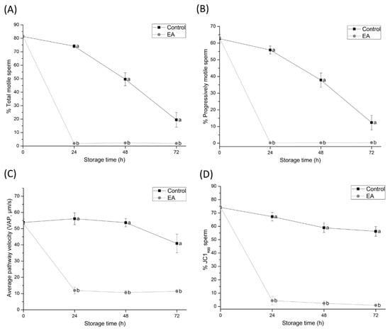 (A) percentages of total motile sperm, (B) percentages of progressive motile sperm, (C) average pathway velocity (VAP; μm/s), and (D) percentages of high ΔΨm sperm (JC1agg sperm) of semen samples treated with ethacrynic acid (EA), a glutathione S-transferases (GSTs) inhibitor, and the control group, assessed at different evaluation times during liquid storage at 17 °C (0, 24, 48, and 72 h). Different letters (a, b) indicate significant differences (p < 0.05) between treatments within storage time.