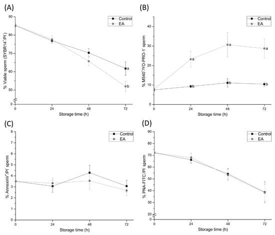 Percentages of (A) total viable sperm (SYBR14+/PI-), (B) viable sperm with high membrane lipid disorder (M540+/YO-PRO-1-), (C) viable apoptotic-like sperm (AnnexinV+/PI-) and (D) viable acrosome membrane-intact sperm (PNA-FITC-/PI-) of semen samples treated with ethacrynic acid (EA), a glutathione S-transferases (GSTs) inhibitor, and the control group, assessed at different evaluation times during liquid storage at 17 °C (0, 24, 48, and 72 h). Different letters (a, b) indicate significant differences (p < 0.05) between treatments within storage time.