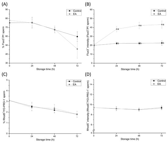 (A) Percentages of viable spermatozoa showing high intracellular calcium levels in the mid-piece and head (Fluo3+/PI−), (B) mean Fluo3+ fluorescence intensity of viable spermatozoa showing high intracellular calcium levels in the mid-piece and head, (C) percentages of viable spermatozoa showing high intracellular calcium levels in the head (Rhod5+/YO-PRO-1–), and (D) mean Rhod5+ fluorescence intensity of viable spermatozoa showing high intracellular calcium levels in the sperm head of semen samples treated with ethacrynic acid (EA), a glutathione S-transferases (GSTs) inhibitor, and the control group, assessed at different evaluation times during liquid storage at 17 °C (0, 24, 48, and 72 h). Different letters (a, b) indicate significant differences (p < 0.05) between treatments within storage time.