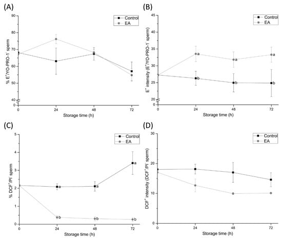 (A) Percentages of viable spermatozoa showing high superoxide (O2-•) levels (E+/YO-PRO-1−), (B) mean E+ fluorescence intensity of viable spermatozoa showing high superoxide levels, (C) percentages of viable spermatozoa showing high peroxide (H2O2) levels (DCF+/PI−), and (D) mean DCF+ fluorescence intensity of viable spermatozoa showing high peroxide levels of semen samples treated with ethacrynic acid (EA), a glutathione S-transferases (GSTs) inhibitor, and the control group, assessed at different evaluation times during liquid storage at 17 °C (0, 24, 48, and 72 h). Different letters (a, b) indicate significant differences (p < 0.05) between treatments within storage time.