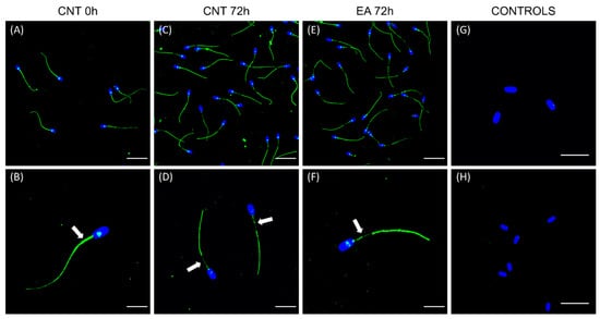 Immunolocalisation of sperm GSTM3. (A,B) control group at 0 h of storage at 17 °C, (C,D) control group at 72 h of liquid-storage, (E,F) Ethacrynic acid (EA)-treated spermatozoa at 72 h of liquid-storage, (G) negative control, and (H) peptide competition assay. White arrows indicate the sperm midpiece. The nucleus is shown in blue colour (DAPI), whereas GSTM3 is shown in green (fluorescein isothiocyanate, FITC). Scale bars: A, C, E, H: 30 μm; D, G: 15 μm; B, F: 10 μm.