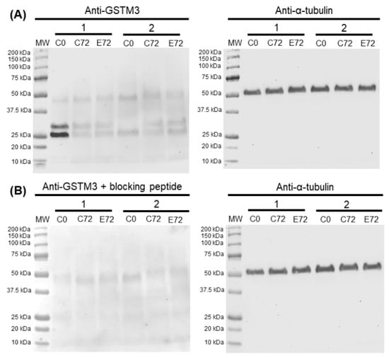 (A) Representative Western blots resulting from the incubation with the GSTM3 antibody (Anti-GSTM3) and its loading control (α-tubulin). (B) Western blots resulting from incubation with the GSTM3 antibody with GSTM3-blocking peptide (Anti-GSTM3 + blocking peptide) and its loading control (α-tubulin). Lanes MW: molecular weight. Lanes C0: control at 0 h of sperm liquid storage. Lanes C72: control at 72 h of sperm liquid storage. Lanes E72: EA-treated samples at 72 h of liquid storage.