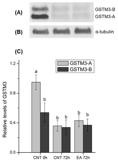 (A) Representative Western blot resulting from incubation with the GSTM3 antibody and (B) its loading control (α-tubulin). (C) Relative abundances of ~25 (GSTM3-A) and ~28 (GSTM3-B) kDa bands as mean ± standard error of the mean in all treatments. Values were normalised using the α-tubulin protein as an internal standard. Each sperm sample (n = 10) was evaluated two times. CNT 0 h: control at 0 h of sperm liquid storage; CNT 72 h: control at 72 h of sperm liquid storage; EA 72 h: Ethacrynic acid (EA)-treated samples at 72 h of liquid storage. Different letters (a, b) indicate significant differences (p < 0.05) between treatments.
