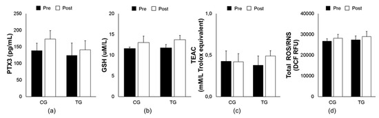 Effects of an 8-week aerobic training on plasma PTX3 (a) and oxidative biomarkers (GSH (b), TEAC (c), and total ROS/RNS (d)) in both trained (TG) and control (CG) groups. Data are means ± SEM. GSH, reduced glutathione; PTX3, pentraxin 3; ROS/RNS, reactive oxygen/ nitrogen species; TEAC, trolox equivalent antioxidant capacity.