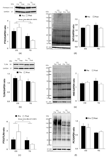 Effects of an 8-week aerobic training on PTX3, TLR4, PTX3/TLR4 ratio, 3NT, 4-HNE and PC expression. Representative Western blots and densitometric quantification of PTX3 (a), TLR4 (b), PTX3/TLR4 ratio (c) 3NT (d), 4-HNE (e), and PC (f) in PBMCs from elderly trained (TG) and control (CG) groups. Data are means ± SEM. The ⁎ indicates a significant (p < 0.05) group × time effect. 3NT, 3-nitrotyrosine; 4-HNE, 4-hydroxynonenal; PC, protein carbonyl; TLR4, toll-like receptor 4.