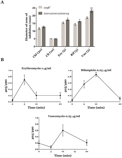 On the other hand, the redox potential (EroGFP2) of Mrx1-roGFP2 was −254 mV in response to rifampicin, −261 mV in erythromycin, and –273 mV in vancomycin. To put this in context, the basal redox potential of this biosensor was established recently as −290 mV [17], whereas the EroGFP2 of Mrx1-roGFP2 in response to 5 mM H2O2 was −264 mV and the intracellular redox potential during host cell infection was −260 mV. Overall, these results confirmed that rifampicin, erythromycin, and vancomycin elicited a significant oxidative stress as part of their mechanism of action.
