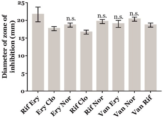 Antimicrobial susceptibility of R. equi 103S+ to 5 µg of different combinations of antimicrobial compounds, including clofazimine (Clo), erythromycin (Ery), norfloxacin (Nor), rifampicin (Rif), and vancomycin (Van). The diameter of the growth inhibition zones was measured to the nearest millimetre, and the mean ± SD of three independent experiments was plotted. Two-way ANOVA and post-hoc Tukey´s multiple comparison tests were performed to assess for statistical significance across conditions. N.s.: Not significant.