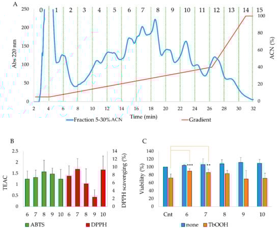 (A)Purification of the 5–30% ACN fraction with RP-HPLC. Fractions were collected every 2 min. (B) Analysis of antioxidant capacity of the purified fractions in vitro with 2,2′-azinobis(3-ethylbenzo-thiazoline 6-sulfonate) (ABTS) (green) and 1,1-diphenyl-2-picrylhydrazyl (DPPH) (red) scavenging tests. (C) Effects of the purified fractions on cell viability in the presence and absence of TbOOH. Caco-2 cells were treated with the indicated fractions for 24 h and oxidative stress was induced by 200 µM TbOOH. Means of at least three experiments (eight replicates for each experiment) were compared with the treated control. (*** p < 0.001, ** p < 0.01).
