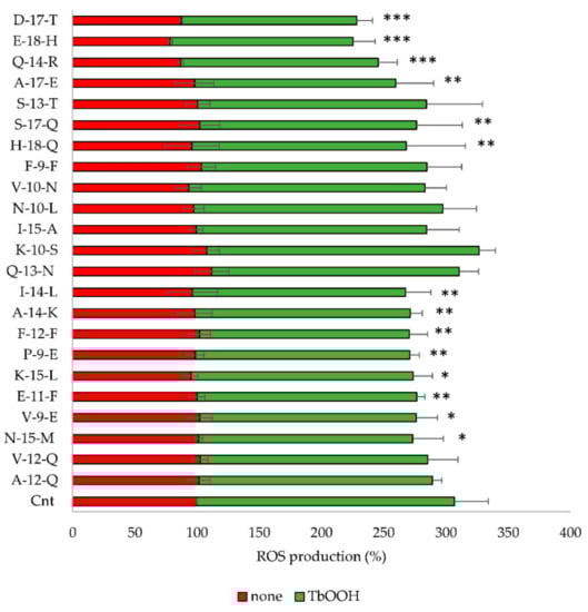 Estimation of reactive oxygen species (ROS) production in Caco-2 cells treated with the indicated peptides (0.05 mg/mL) in the absence (red) or presence (green) of 250 µM TbOOH. The values at 5000 s were reported and the means of at least three experiments (four replicates for each experiment) were compared with the treated control. (*** p < 0.001, ** p < 0.01, * p < 0.05).