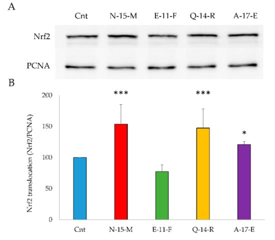 Nrf2 translocation from cytosol to nucleus in Caco-2 cells in the presence of N-15-M, E-11-F, Q-14-R and A-17-E. (A) Cells were treated with 0.05 mg/mL of each peptide for 24 h. Nuclear fractions were isolated and proteins were subjected to WB detection as indicated in paragraph 2.15. (B) Densitometric analysis of four experiments compared with the control were reported, using PCNA as loading control. (*** p < 0.001, * p < 0.05).